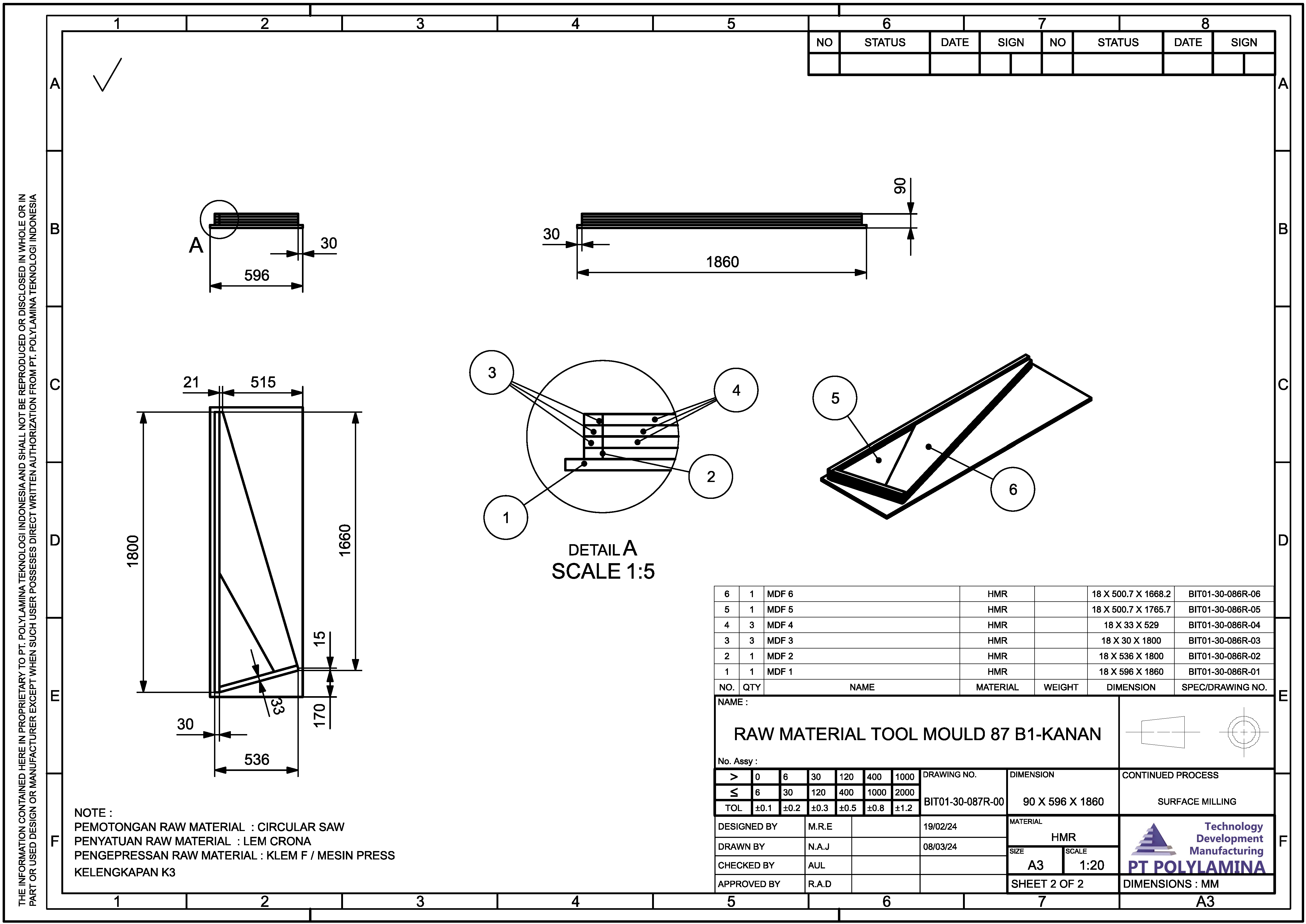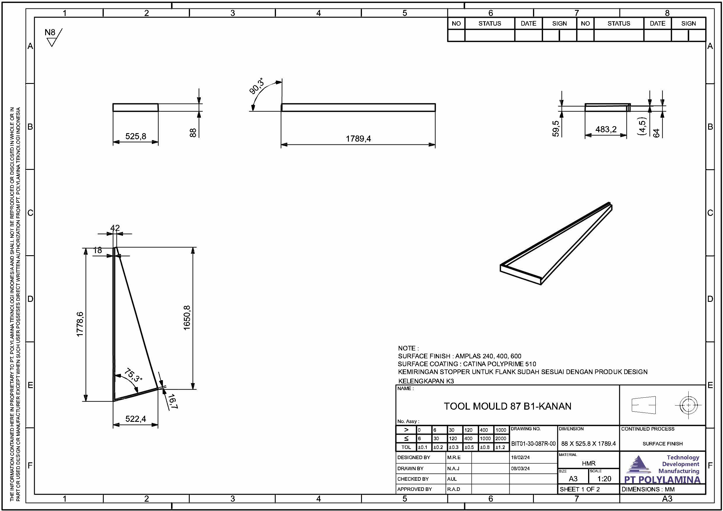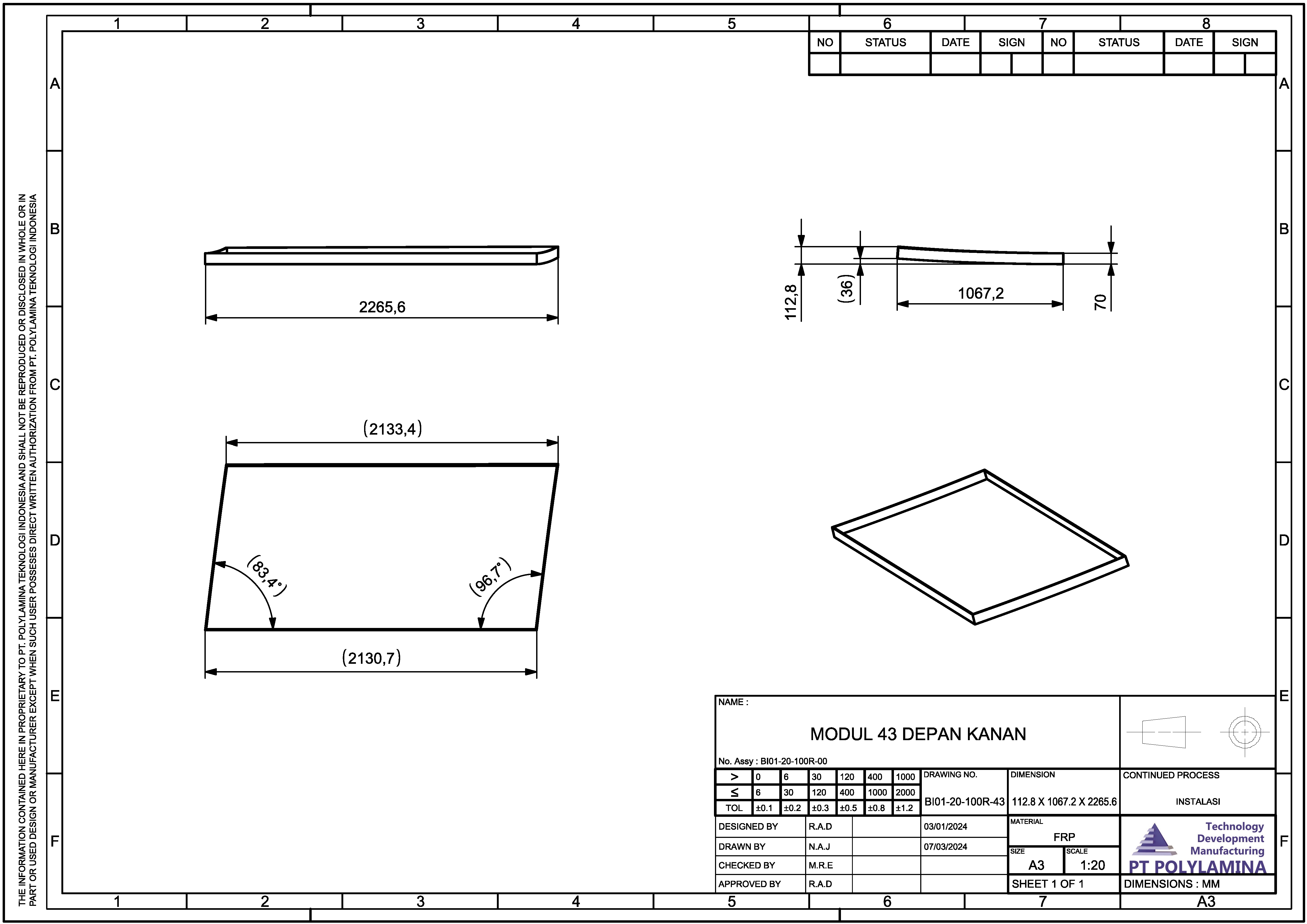This project focuses on designing and manufacturing a mold for Fiber Reinforced Polymer (FRP) production. The process begins with developing a 3D mold based on the product design, ensuring it meets the required specifications for fabrication. Once the mold design is complete, raw material preparation is initiated. A draft of both the mold and raw material specifications is then sent to the production sector for further processing.