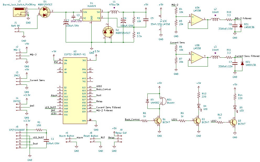Paerosafe is an IoT-based smart home device designed to enhance household safety by detecting fire hazards and monitoring air quality. Fires in homes often result from electrical short circuits and gas leaks, while poor air quality is influenced by ventilation and cleanliness factors. Paerosafe integrates multiple sensors, including MQ2 for gas detection, DHT for temperature and humidity, ZMCT103C for AC current monitoring, and GP2Y1014AU0F for dust concentration measurement, all controlled by an ESP32 microcontroller. When a fire is detected based on abnormal temperature, gas levels, electrical current, or smoke particles, the system automatically cuts off the electric current using a relay to prevent further damage. The collected data and alerts are transmitted to a cloud-based database and user interface, allowing homeowners to monitor real-time conditions via the internet.