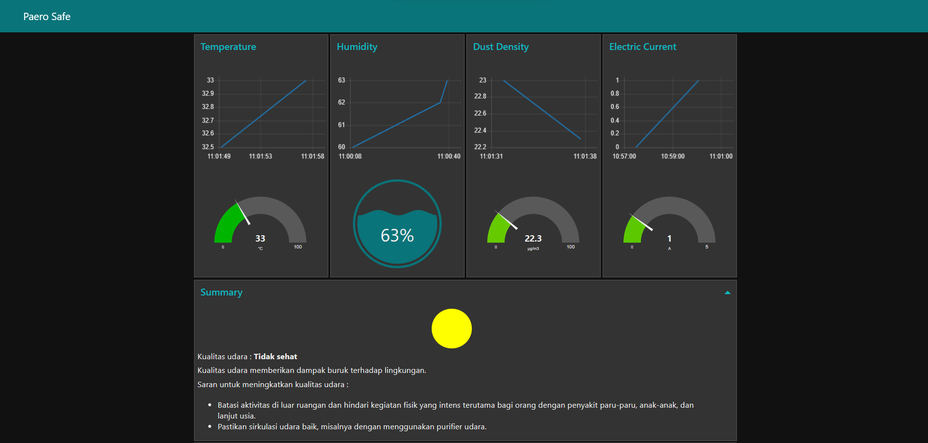 Beyond fire prevention, Paerosafe also serves as an air quality monitoring tool by assessing particulate matter (PM) levels and converting them into an Air Pollution Standard Index (ISPU) value. This enables users to track changes in air quality over time, raising awareness of environmental conditions and potential health risks. On a larger scale, widespread adoption of Paerosafe in Indonesia could significantly increase public awareness of air pollution and climate change, potentially influencing government policies on environmental management. By providing both immediate safety and long-term environmental insights, Paerosafe offers a comprehensive solution for improving home safety and fostering greater ecological responsibility.