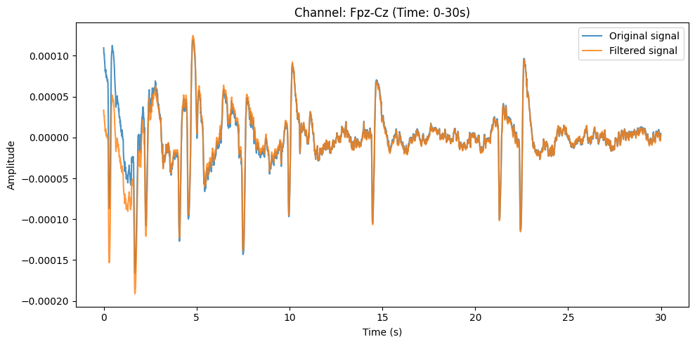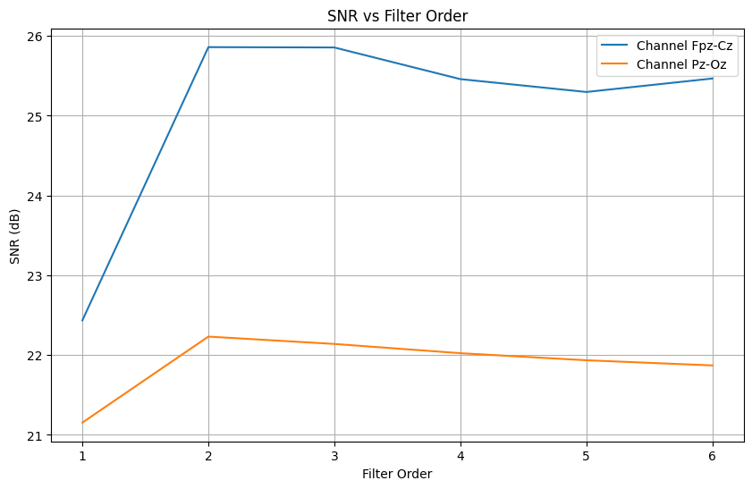 This project focuses on classifying sleep stages using EEG data from Fpz-Cz and Pz-Oz channels. The process begins with data preprocessing, where a Butterworth filter (0.1 Hz to 50 Hz) is applied and tested across filter orders from 1 to 10 to optimize the signal-to-noise ratio (SNR). After filtering, key features are extracted from the EEG signals to identify sleep stages. The extracted features then undergo a selection process to enhance classification performance and reduce computational complexity.