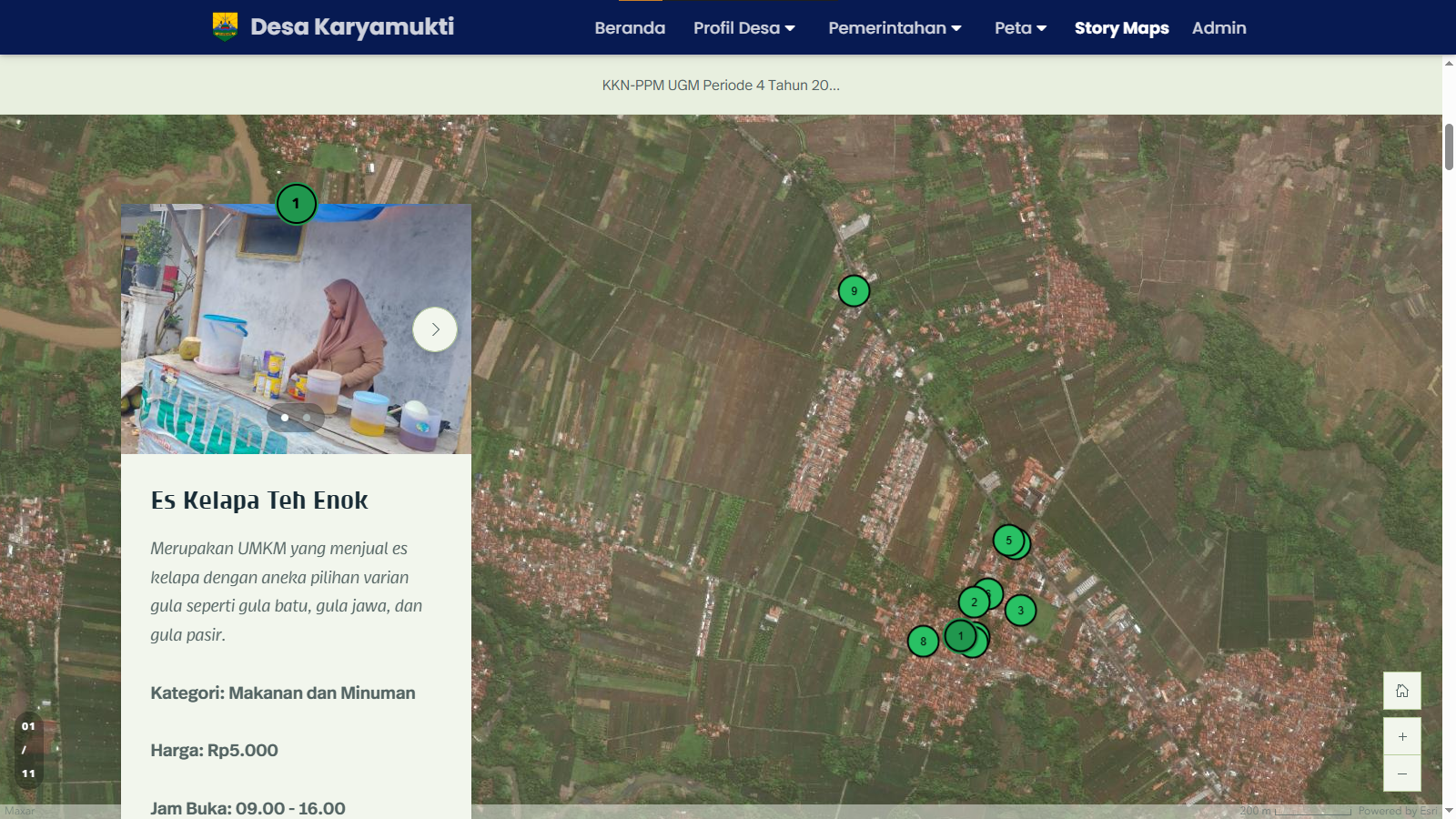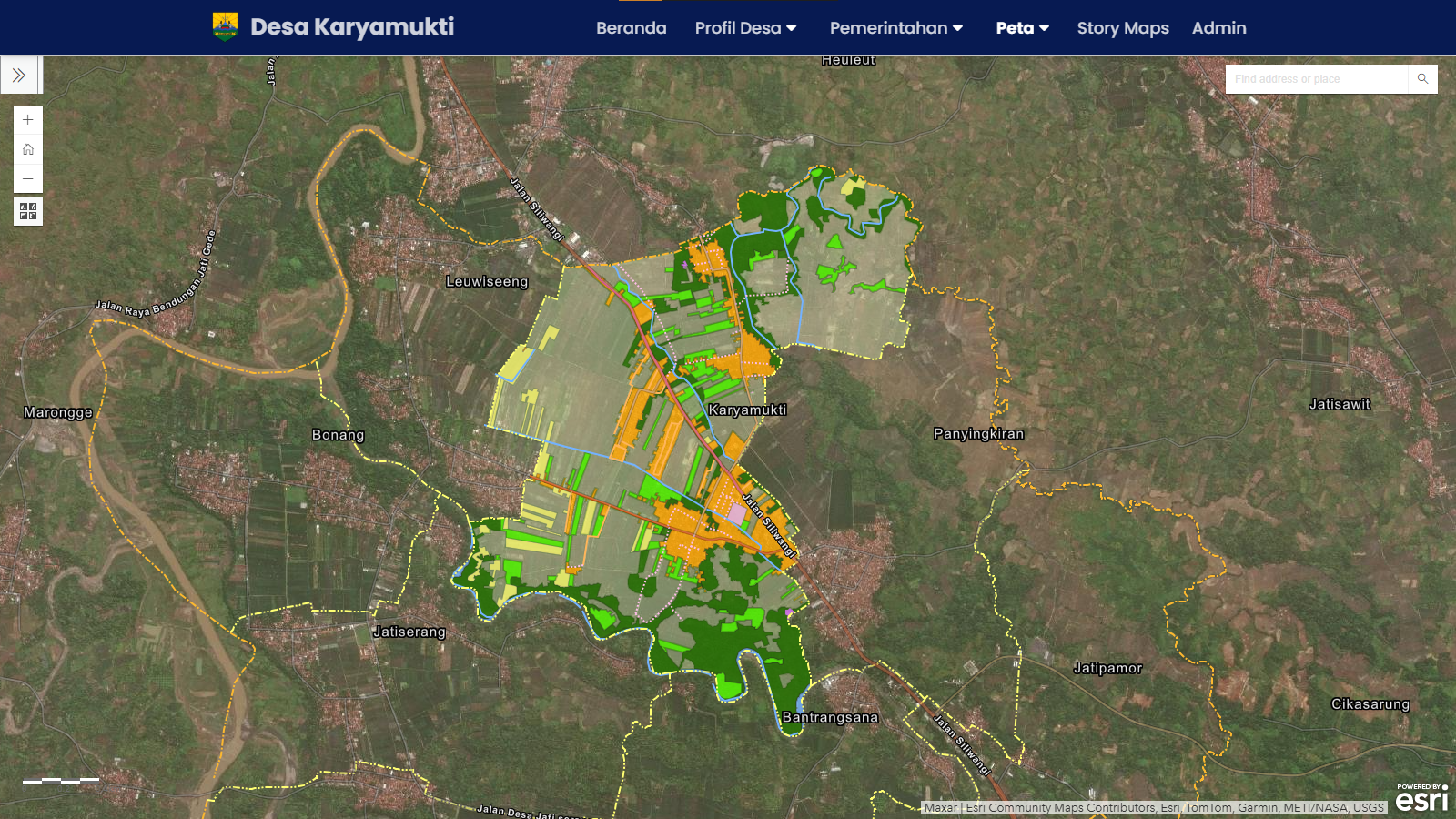 To enhance user engagement, the website includes interactive story maps showcasing Karyamukti’s unique culinary offerings. It also provides maps related to land cover and usage, groundwater distribution, and RT RW (spatial planning) administration. This platform serves as an informative and visually engaging resource for both residents and visitors.